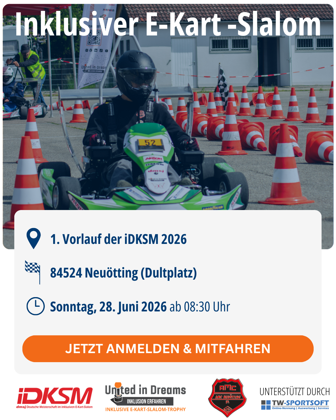 Dann ist die iDKSM – die dmsj Deutsche Meisterschaft im inklusiven E-Kart-Slalom genau das Richtige für dich!