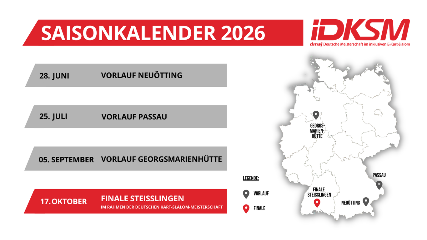 Auch im Jahr 2026 soll die iDKSM sowie die Inklusive E-Kart-Slalom-Trophy fortgesetzt werden. Die Planungen für die deutschlandweiten Vorläufe und das große Finale laufen bereits auf Hochtouren. Sobald der offizielle Saisonkalender feststeht, findet Ihr alle Termine und Informationen hier auf unserer Website sowie auf unseren Social-Media-Kanälen.